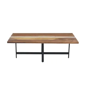 Our mixed-material coffee table, with its solid acacia wood top, white resin inlay, and black powder-coated metal base, offers you the opportunity to own a striking example of contemporary design. Hopper Furniture is at the forefront of using colored resins to create unique pieces of furniture. The soft, matte white resin in this table complements the gorgeous graining of the acacia wood to bring a sophisticated yet organic look to the table. This will make a striking addition to your living room or den.